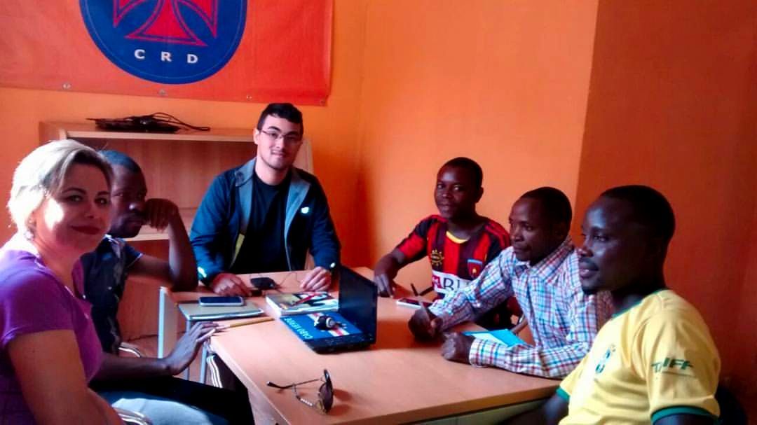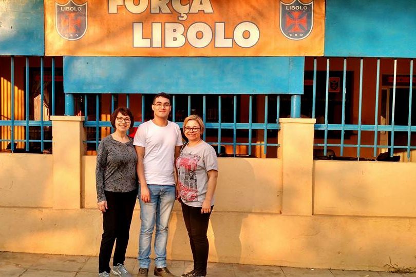 Vinicius Santos com Margarida Petter e Márcia Oliveira junto da Sede do Recreativo do Libolo (2016).